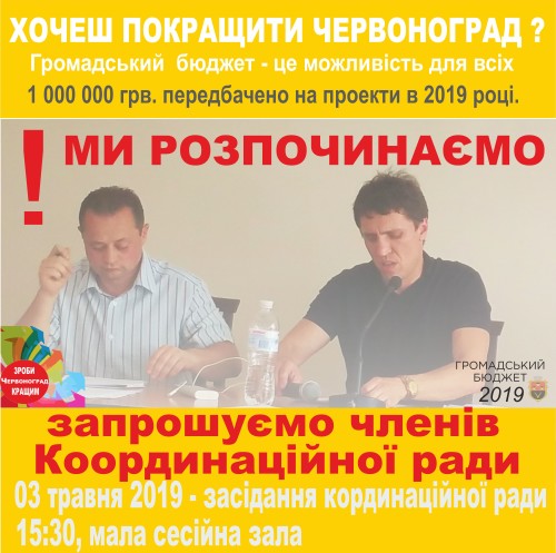 ОГОЛОШЕННЯ 03.05.2019, 15:30 - відбудеться засідання Координаційної ради з питань Громадського бюджету. ЗАПРОШУЄМО членів координаційної ради. У нас хороші новини - цьогоріч на найкращі ідеї передбачено 1 000 000 грв. ! Більше шансів - більше можливостей!